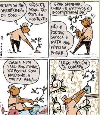 No texto do filósofo Karl Popper, originalmente publicado em 1945, embora seja com frequência citado, até mesmo em postagens e memes da internet, o argumento central do paradoxo da tolerância de Popper (que ele apresenta em conjunto com o paradoxo da liberdade e o paradoxo da democracia) é de que se houver tolerância para com os intolerantes (racistas, fascistas, neonazistas), eles levarão à destruição dos tolerantes e, por consequência, da tolerância. A sociedade deve se proteger pelos argumentos racionais, pela opinião pública e pela aplicação das leis. Esse argumento mostra, do mesmo modo, que não pode haver liberdade para “destruir o outro” ou minar a sociedade. A tirinha remete a essa ideia indicando que um discurso de ódio, ignorado ou mesmo incentivado (patrocínio, visibilidade), torna-se um risco para a sociedade e seus cidadãos. (14ª olimpíada nacional em História do Brasil, 2024).
