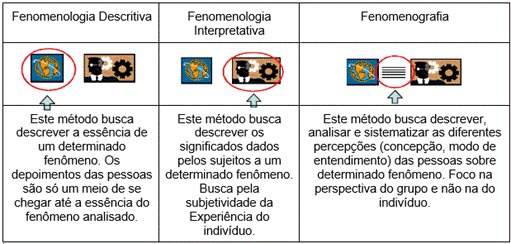 Dentro do escopo de uma investigação qualitativa descritiva existem diversos processos sob os quais a pesquisa pode estruturar-se. Métodos como a fenomenologia descritiva, a fenomenologia interpretativa e a teoria fundamentada se mostram pertinentes, mas oscilam entre o foco no indivíduo e o foco no fenômeno (Cherman, 2013). Contudo, baseado no princípio de que as percepções são individuais, mesmo abordando um fenômeno compartilhado, e que a compreensão do mesmo está atrelada de forma indissociável a essas concepções, trazem a possibilidade de uma pesquisa estruturada no método fenomenográfico, pois este visa a identificação da essência da experiência humana ligada a um determinado evento, segundo a ótica dos participantes. Temos de nos atentar à diferenciação de métodos entre fenomenologia e fenomenografia, que, numa simplificação, é expressa por Marton (como e citado em Dias, 2010) como “Na fenomenologia, o foco de interesse é a ‘essência da experiência’, enquanto que a fenomenografia, como vimos, preza pela variação das experiências, pelas relações entre os indivíduos e os aspectos do mundo a sua volta” (pp 70-71).