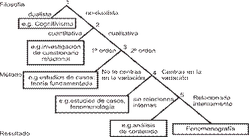 Por fim, na pesquisa fenomenográfica, o conjunto das categorias descritivas estruturado logicamente é chamado de espaço de resultados (outcome space). Segundo Marton & Booth (1997), todo espaço de resultados deve orientar-se a criar categorias distintas sobre o fenômeno e que apresentem uma relação lógica e/ou hierárquica entre sí. Também é desejável que o espaço de resultados apresente o menor conjunto possível de categorias descritivas para que se possa captar as variações das concepções.