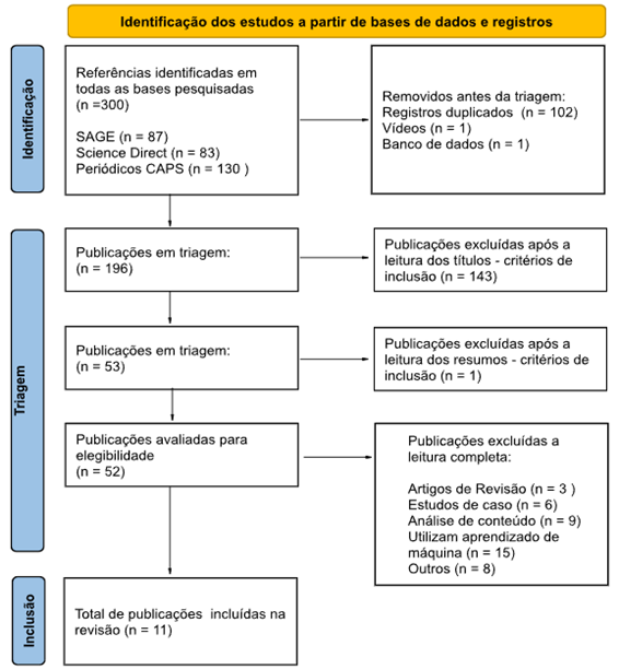 A estratégia de busca identificou um total de 300 publicações nas bases de dados SAGE, Science Direct e Periódicos Capes. Desses estudos encontrados, 102 foram removidos por serem duplicados, 1 foi removido por ser vídeo e 1 foi removido por ser um banco de dados, totalizando 104 artigos excluídos antes da triagem. Dos 196 artigos restantes, 143 foram excluídos por não atenderem aos critérios de inclusão considerando os títulos (n = 143) e os resumos (n = 1). Em seguida, os 52 artigos restantes foram lidos na íntegra, e 41 foram excluídos por estarem dentro dos critérios de exclusão definidos. Por fim, 11 artigos foram elegíveis para a presente revisão, conforme mostrado na Figura 1.
